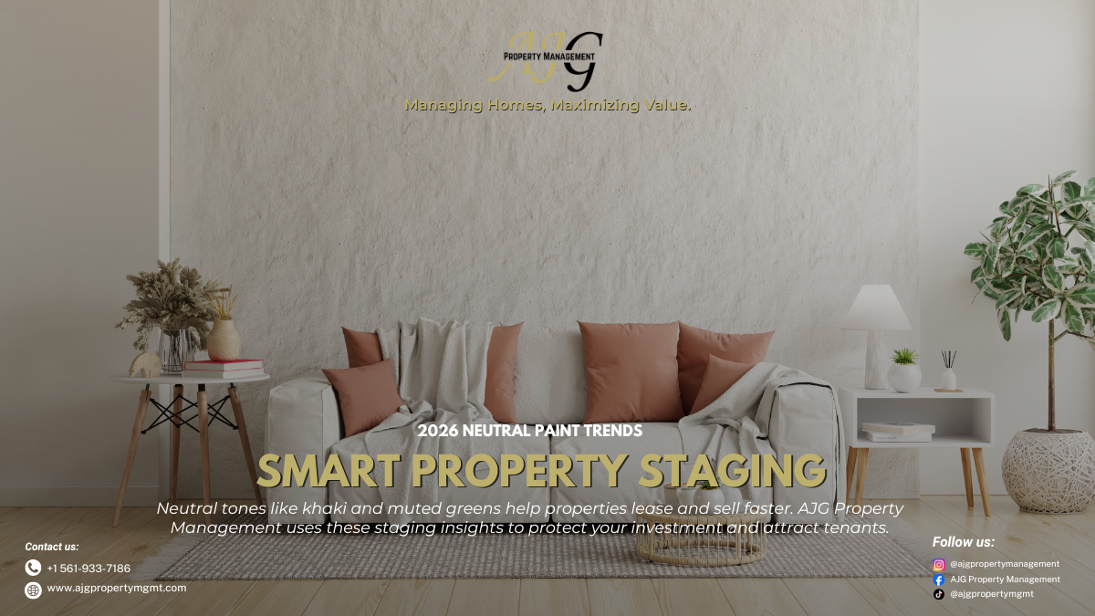 🛋️🏡 Neutral tones aren’t just stylish—they’re strategic. Smart staging with khaki and muted greens helps properties lease and sell faster, while protecting your investment. At AJG Property Management, we use insights like these to maximize value and keep your property market-ready 💼✨ #AJGPropertyManagement #ManagingHomes #MaximizingValue #PropertyCare #SmartStaging