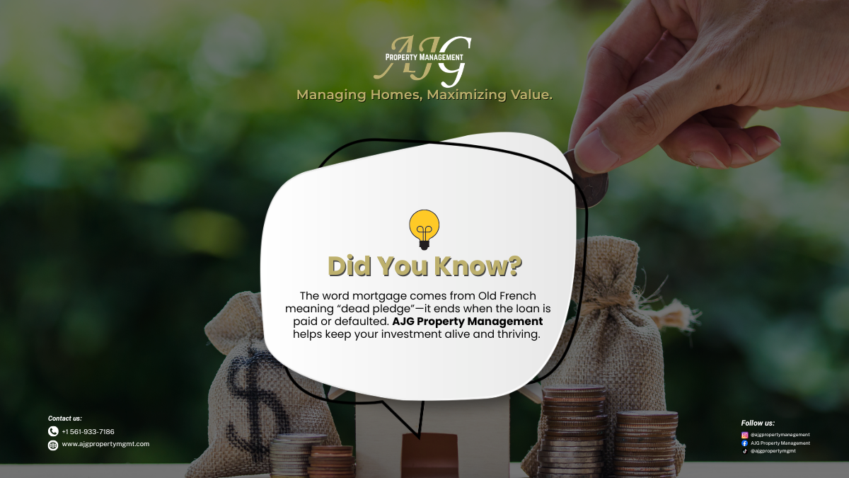 💡🏡 The word mortgage comes from Old French meaning “dead pledge”—but with smart property management, your investment stays alive and thriving. At AJG Property Management, we protect your property, maximize value, and keep every detail working for your future 💼✨ #AJGPropertyManagement #ManagingHomes #MaximizingValue #PropertyCare #InvestmentManagement The body content of your post goes here. To edit this text, click on it and delete this default text and start typing your own or paste your own from a different source.
