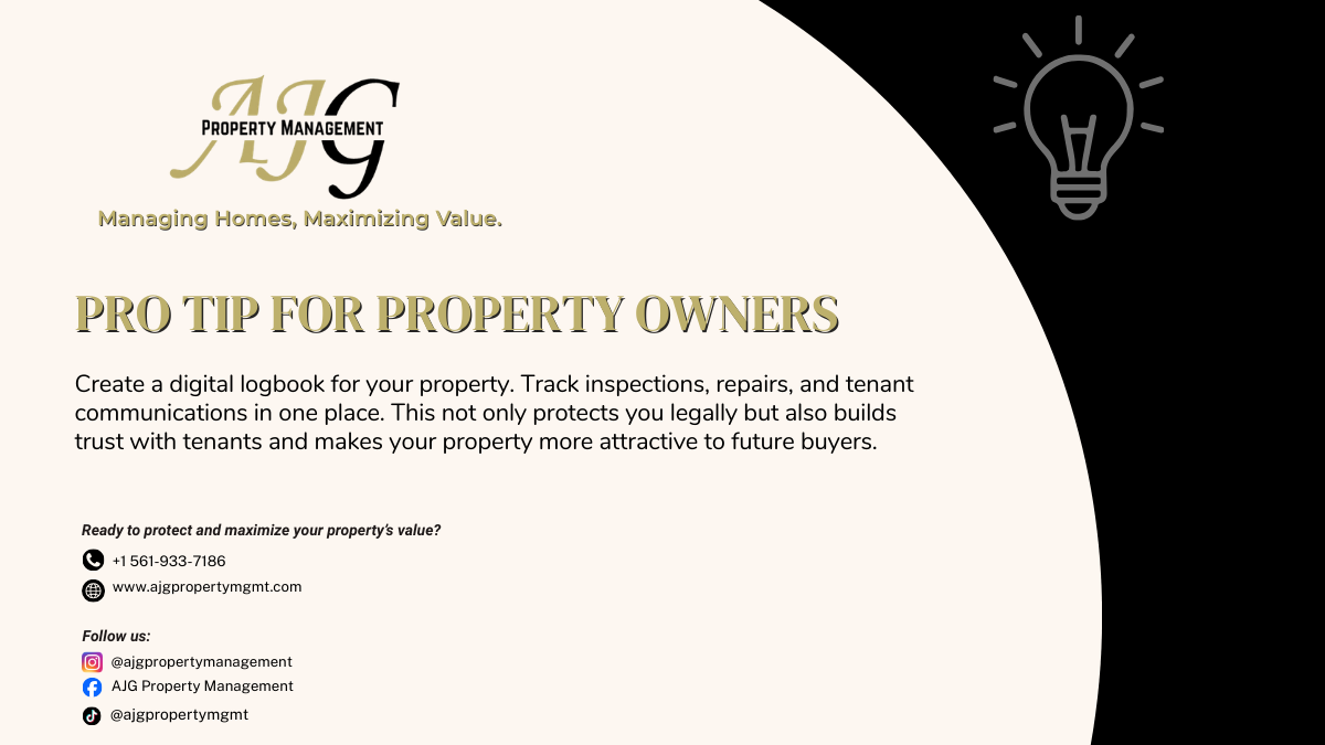 📲🏡 A well-managed property isn’t just about repairs—it’s about documentation too. Keeping a digital logbook of inspections, repairs, and tenant communications protects you legally, builds trust, and adds long-term value. Smart management today means stronger investments tomorrow 💼✨ #AJGPropertyManagement #ManagingHomes #MaximizingValue #PropertyCare #EfficientManagement