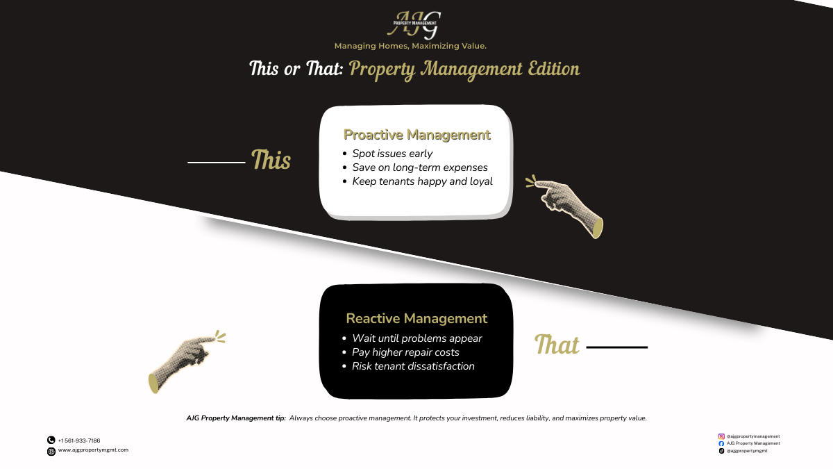 🔑🏡 When it comes to managing homes, the choice is clear—proactive beats reactive every time. Spotting issues early saves money, keeps tenants happy, and protects your investment. Smart management today means fewer headaches tomorrow 💼✨ #AJGPropertyManagement #ManagingHomes #MaximizingValue #PropertyCare #ProactiveManagement